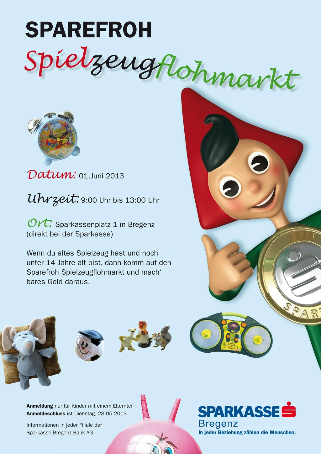 Die Sparkasse Bregenz und die Stadt Bregenz laden am Samstag, 01.06.2013, zum ersten Sparefroh Spielzeugflohmarkt in Bregenz ein.