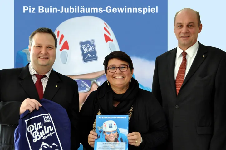 Anlässlich des 150jährigen Jubiläums der Piz Buin-Erstbesteigung veranstalteten die Vorarlberger Sparkassen gemeinsam mit Montafon Tourismus, den Montafoner Museen, Illwerke Tourismus und Fohrenburger ein landesweites Gewinnspiel. Aus über 5.000 Einsendungen wurde die Gewinnspielkarte von Frau Manuela Witzgall aus Hard gezogen.