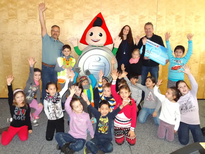 Der angesparte Betrag wurde und von der Sparkasse Bregenz verdoppelt. Der Spendenscheck über 150 Euro wurde vom Sparefroh an die gesamte Klasse überreicht.