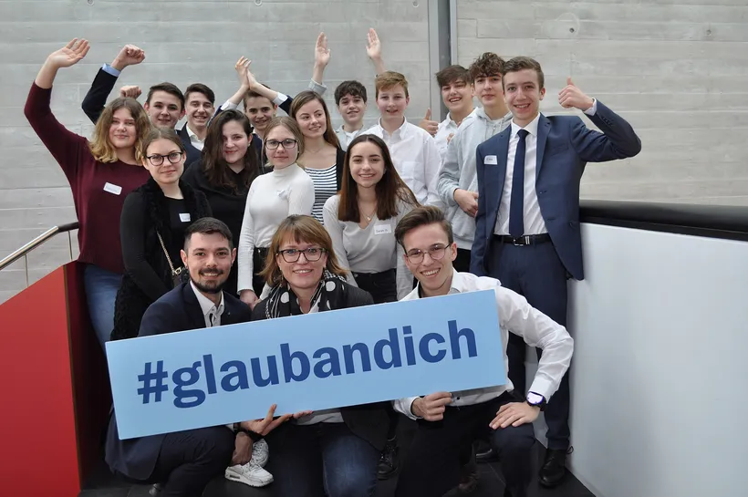 Filialleiter Michael Felder, Personalleiterin Verena Depaoli und Lehrling Valentin Reif mit den motivierten Lehrlingsanwärtern