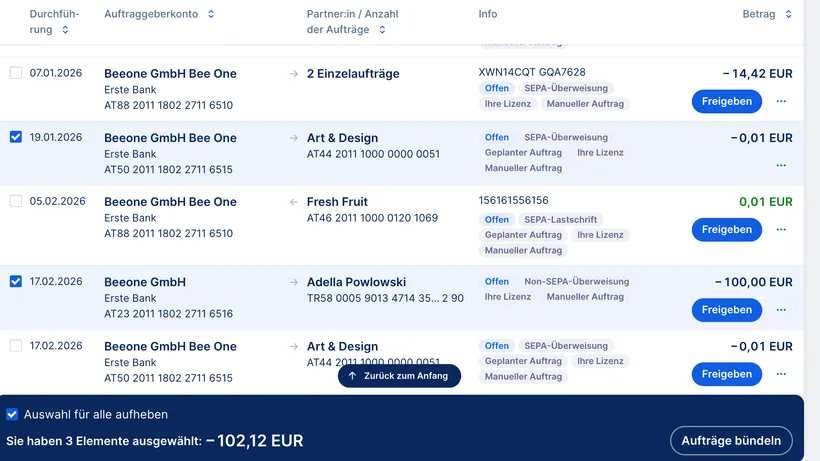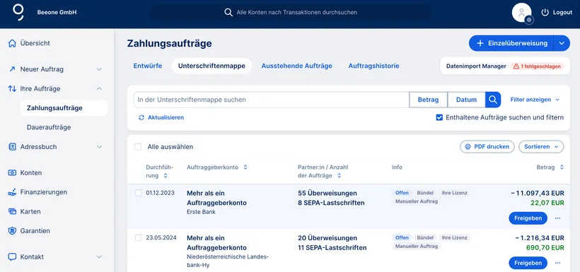 Wenn Sie einen Auftrag freigeben möchten, können Sie das auf unterschiedlichen Wegen machen. Haben Sie das „Bitte beachten Sie“-Widget auf Ihrer Übersichtsseite aktiviert, dann erinnert George Sie hier direkt an Aufträge, die Sie freigeben können. Mit einem Klick auf die offenen Aufträge kommen Sie direkt zu Ihrer Unterschriftenmappe.