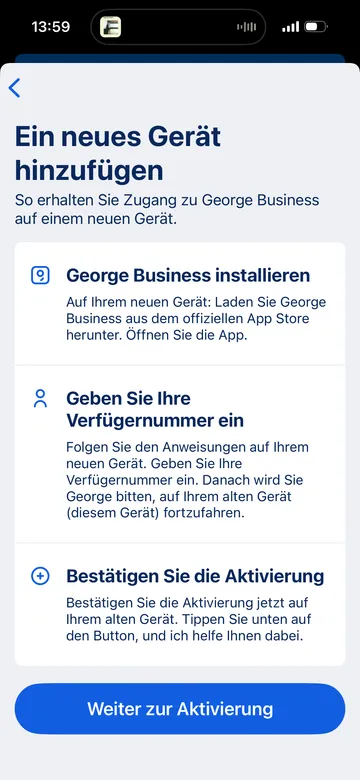 George Business Web Browser: Sie brauchen ein Gerät mit installierter George App, wo Sie George ID aktiviert haben. Das kann entweder die George Business Handy App oder George ID für den Computer sein. Sie müssen die App eventuell öffnen, um die Anfrage anzuzeigen. Dann bestätigen Sie die Anmeldung oder Transaktion mit George ID.