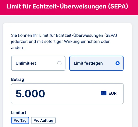 Mit Echtzeit-Überweisungen (SEPA) können Sie rund um die Uhr und innerhalb weniger Momente Geld überweisen. Dank der EU Instant Payments Regulation (IPR) haben Sie ab dem 9. Oktober 2025 nun mehr Kontrolle. Die 100.000 € Obergrenze für Echtzeit-Überweisungen entfällt, und Sie können für jedes Konto ein eigenes Limit festlegen. Das bedeutet (noch) mehr Flexibilität und Sicherheit.