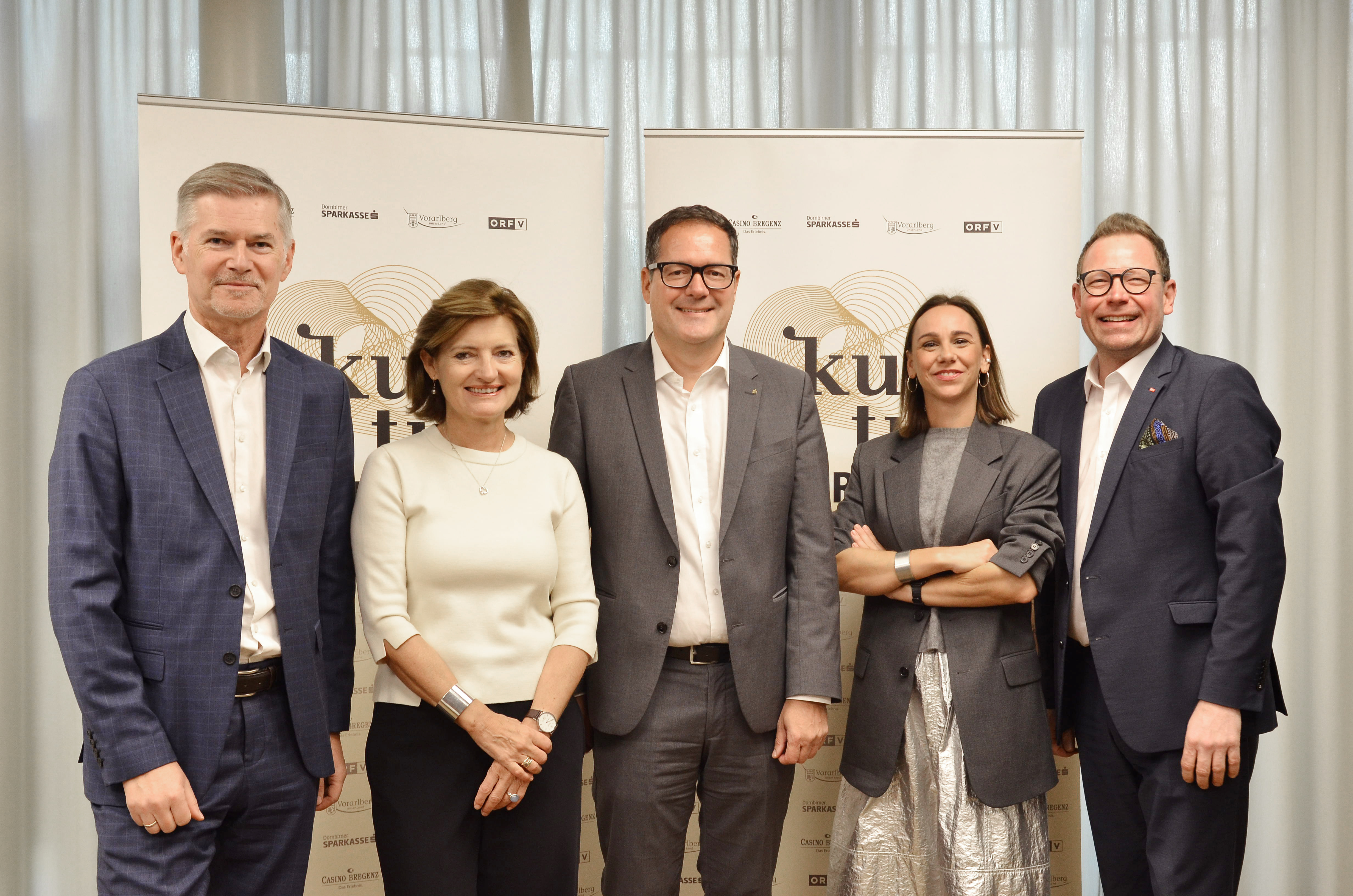v. l.: Dir. Bernhard Moosbrugger (Casino Bregenz), Mag. Jasmine Ölz-Barnay (ORF Vorarlberg Kultur), VDir. Mag. Martin Jäger, MBA (Dornbirner Sparkasse), Mag. Claudia Voit, M. A. (Land Vorarlberg Kulturabteilung) und Dir. Markus Klement (ORF Vorarlberg)