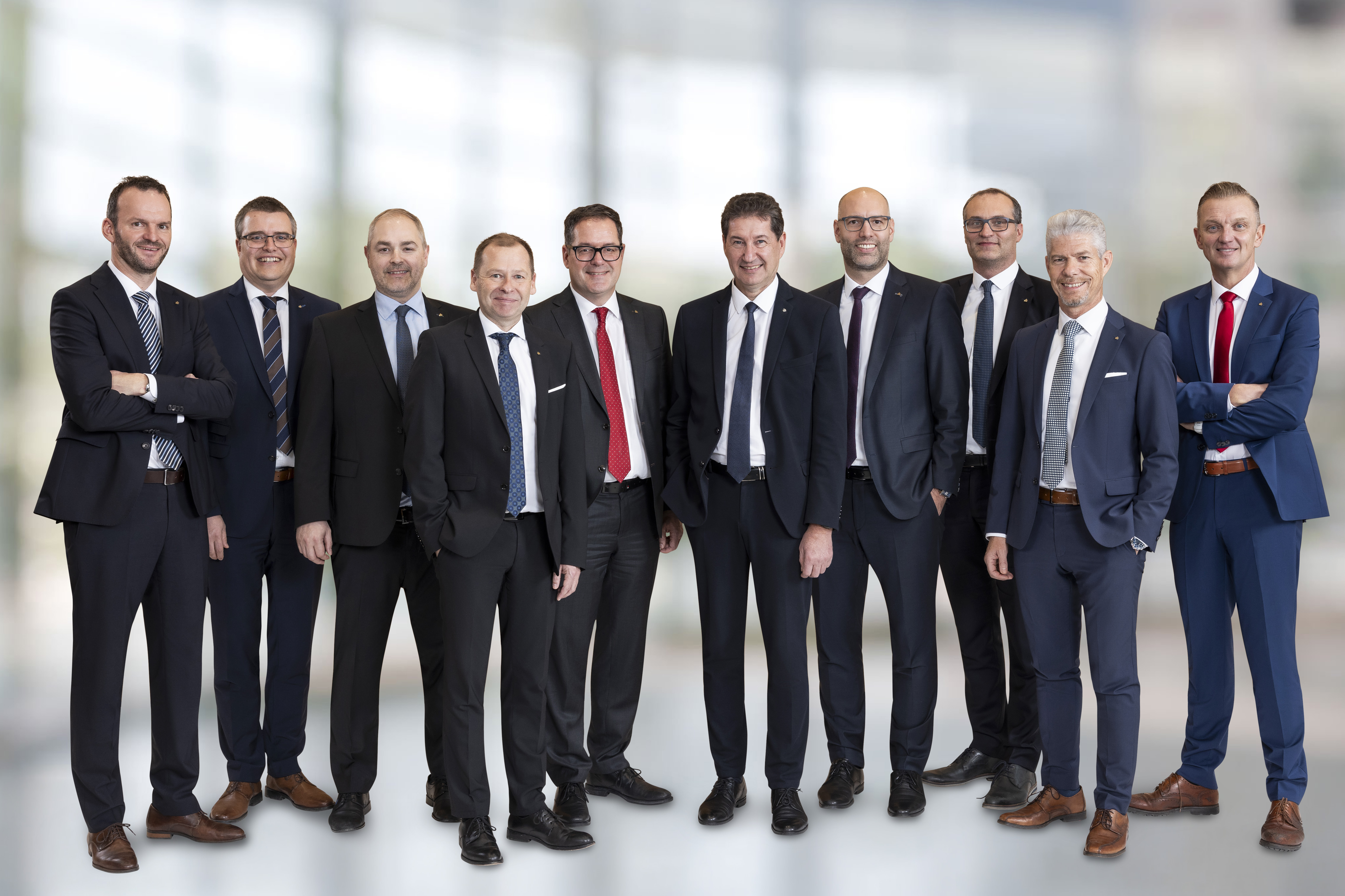 Die Vorstände der Vorarlberger Sparkassen (v. l.): Jürgen Schneider und Hannes Moosmann (Sparkasse Egg), Mag. (FH) Daniel Mierer und Hermann Bachmann (Sparkasse Feldkirch), Mag. Martin Jäger, MBA, Sprecher der Vorarlberger Sparkassen, und Harald Giesinger (beide Dornbirner Sparkasse), Clemens Lengauer und Mag. Johannes Hämmerle (Sparkasse Bregenz) sowie Mag. (FH) Thomas Schreiber, MA und Dr. Wolfgang Eichler