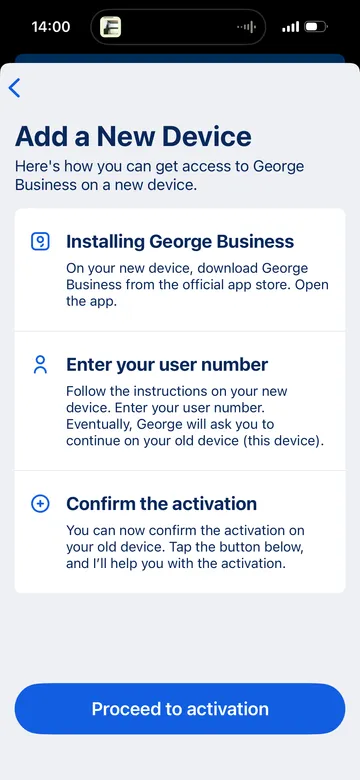 George Business mobile app: You can sign the login or transfer directly in the George Business app on your phone. You may need to refresh your screen to see the request. You can then approve it with your George ID PIN or your biometric data.
