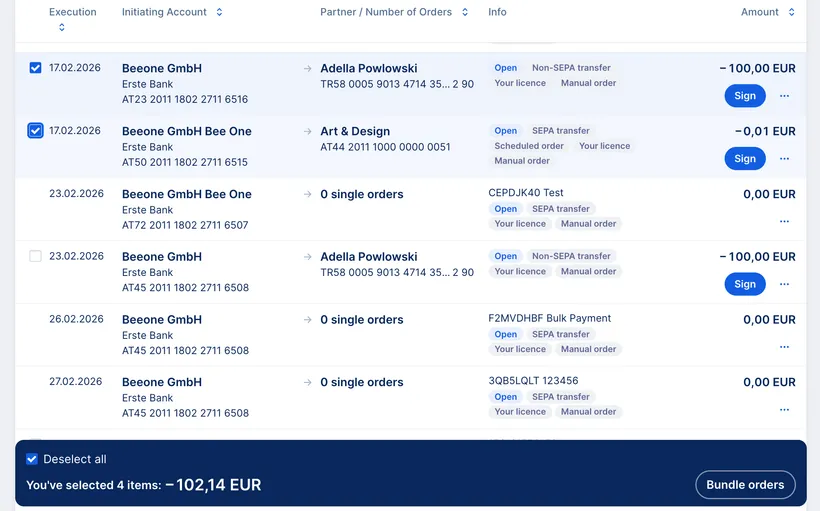 You can combine different payment orders into a "bundle" and sign them with one signature.