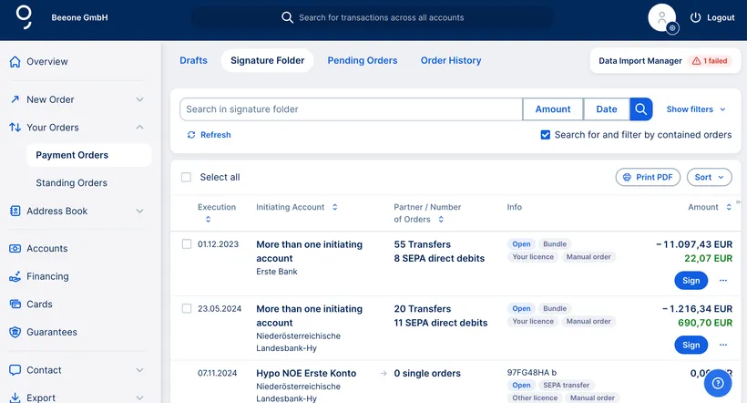 After the first authorised signatory has signed, George checks whether all signatures required for execution have been made. In the case of collective signing, the second signature can now be executed. If all signatures are present, the order is processed immediately and stored in your order history.