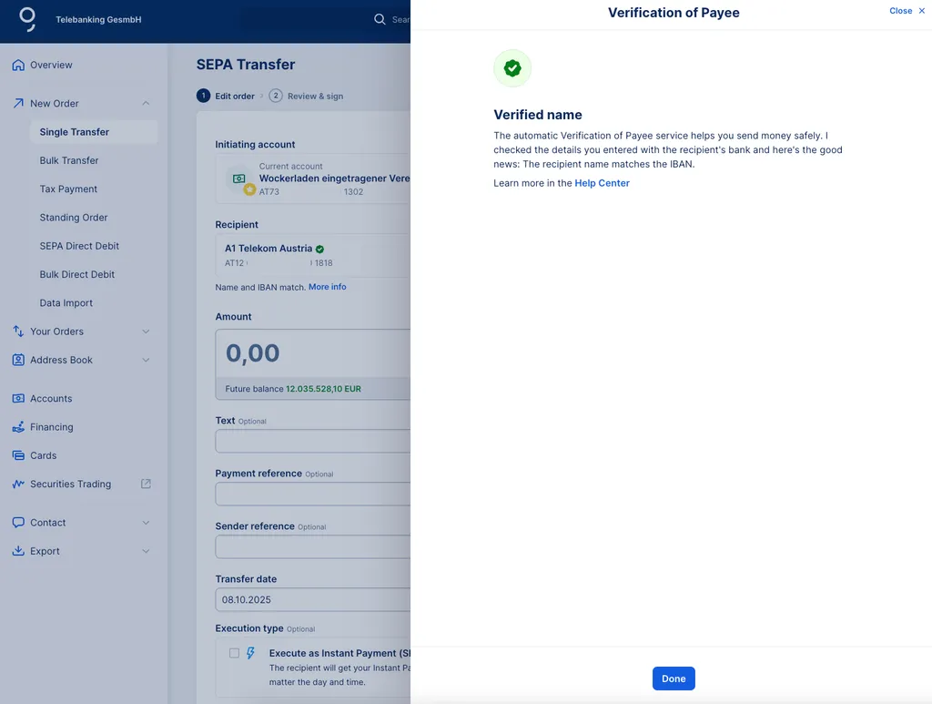 The Verification of Payee service is available from 09 October 2025, in line with the "Instant Payment Regulation". From then on, George will start checking recipient details with every SEPA transfer. If you see a warning, it doesn't always mean that something is wrong with the transfer. However, it's recommended that you check the recipient details (name & IBAN).