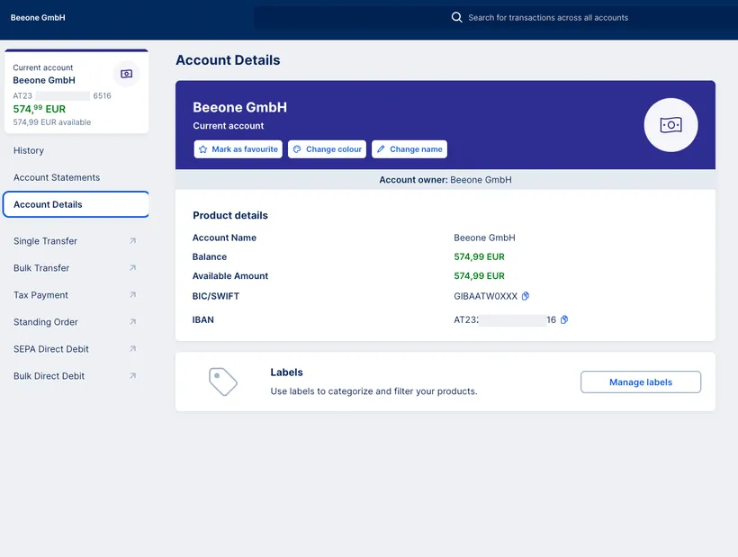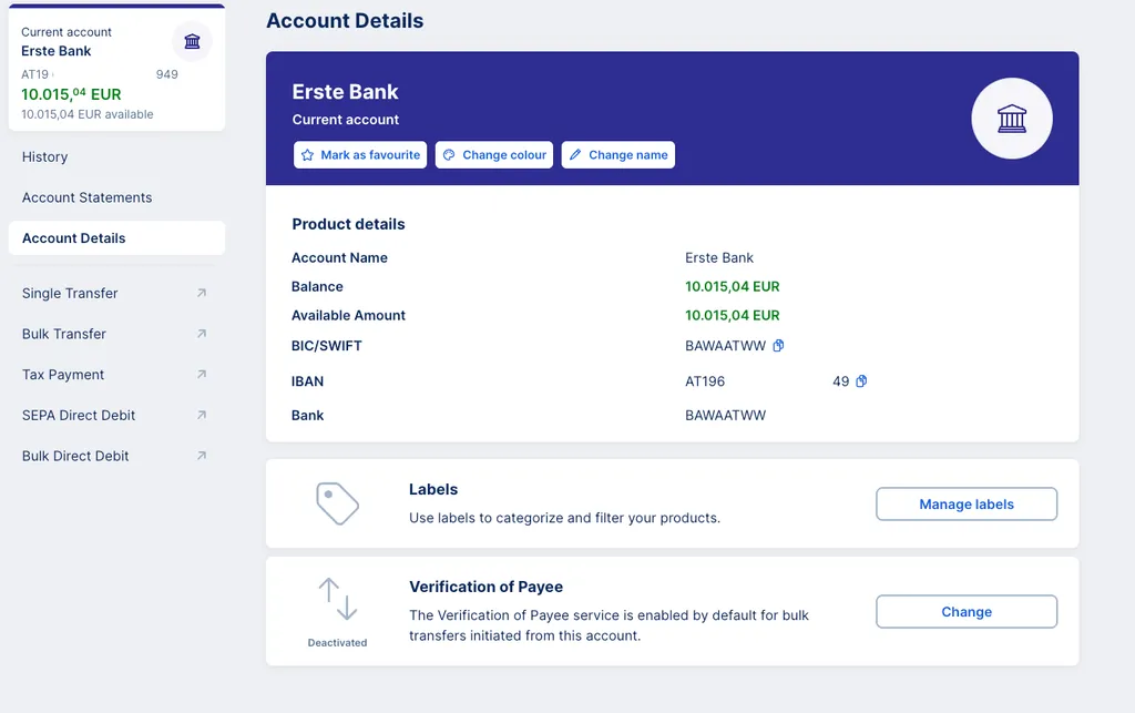 As a George Business admin, you can activate or deactivate verification for all bulk transfers in your account settings. Under "Accounts", select the account for which you would like to activate or deactivate the verification service. Then, select "Account Details" and look for the "Verification of Payee" section.