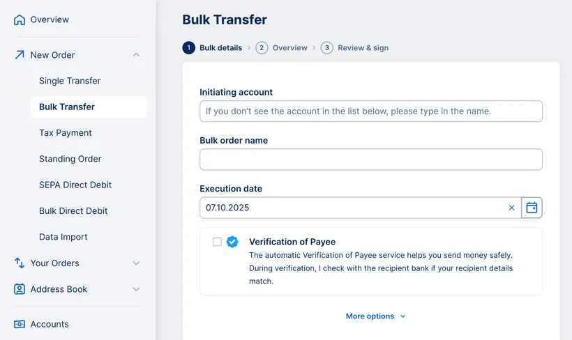 When you create a new bulk transfer, you can decide to activate the Verification of Payee service for the transfer. You can only activate the verification for the whole transfer, not for individual orders or recipients.
