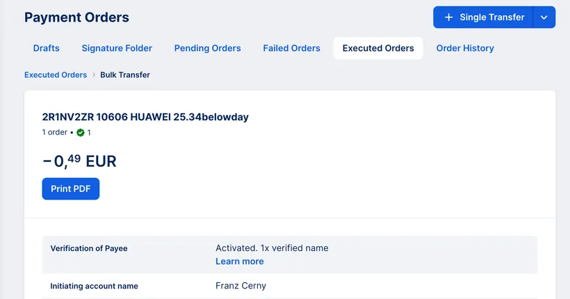 The Verification of Payee service is also available for transfers with a large number or receipients. However, for these transfer types, the service is optional. When you create a bulk transfer or make a data import, you can decide if you'd like to activate the Verification of Payee service.