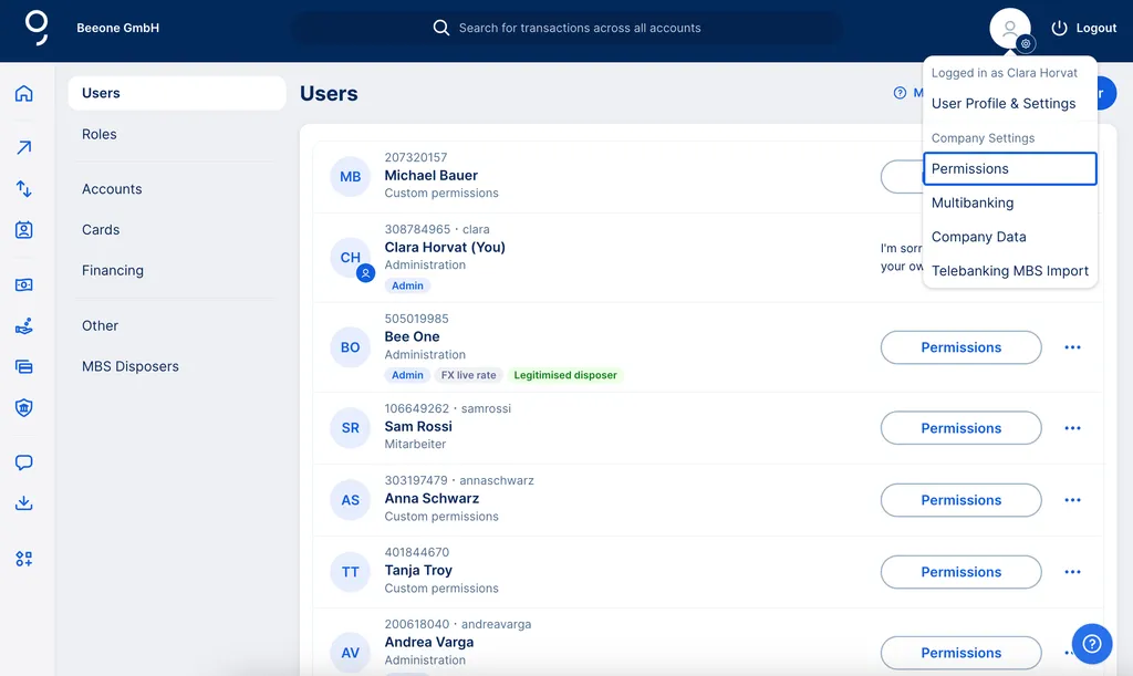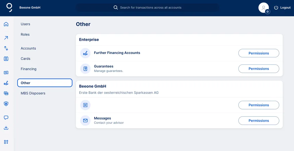 If you administrate your George Business license for more than one company, or you have a customer relationship with multiple Erste Bank and Sparkasse institutes, you will accordingly find multiple entries in the "Other" sub-menu. You can give users or roles permissions - as described above - respectively for a single company or many.