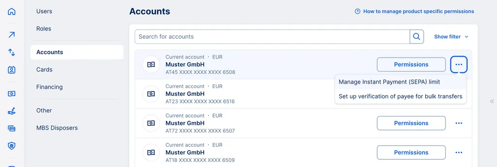 From your admin section, you can assign and change permissions for accounts, cards and financing. George Business gives you plenty of flexibility. For each product, you can choose settings by individual user or by role. And decide to do one at a time, or more in one go.