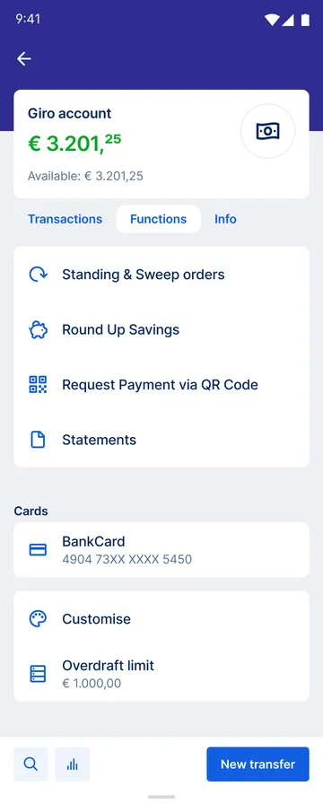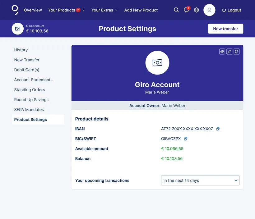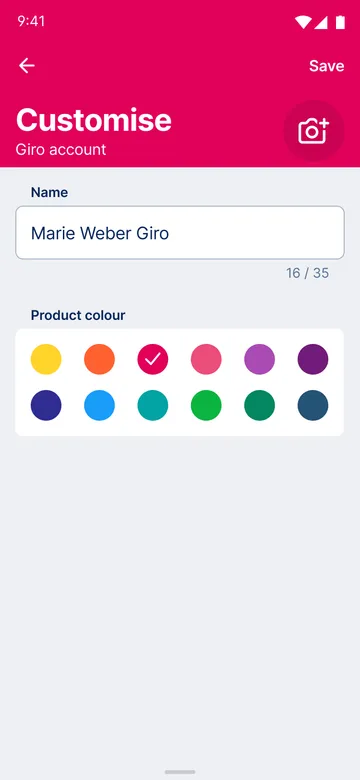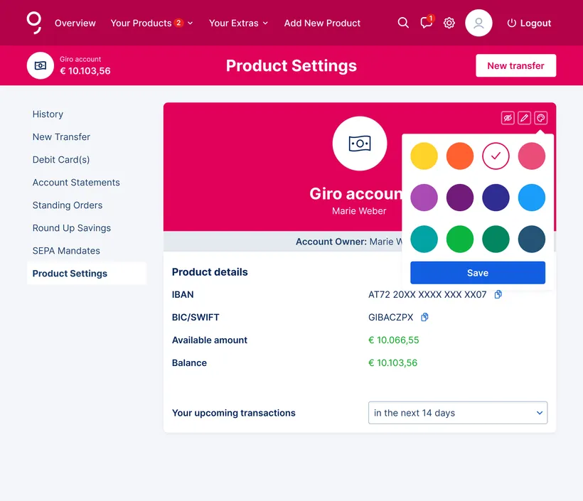 Changing the colour of your accounts and cards is not the only way to personalise your g(e)orgeous banking experience. You can also work with different pictures, change names or show and hide certain overview elements to personalise George even more. Try it out and simply have some fun with it.