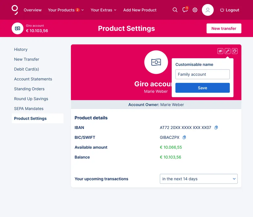 But changing the name of your accounts and cards is not the only way to personalise your g(e)orgeous banking experience. You can also work with different colours, add a picture or show and hide certain elements to personalise George even more. Try it out and have fun with it.