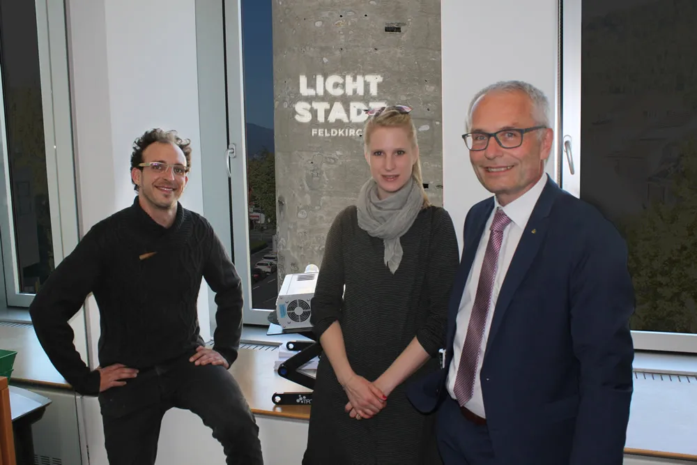 Foto (v.li.): Jan Raphael Knieza (Künstlerkollektiv ArtificialOwl), GF Sina Wagner (Lichtstadt) und Vorstandsdirektor Anton Steinberger (Sparkasse Feldkirch)