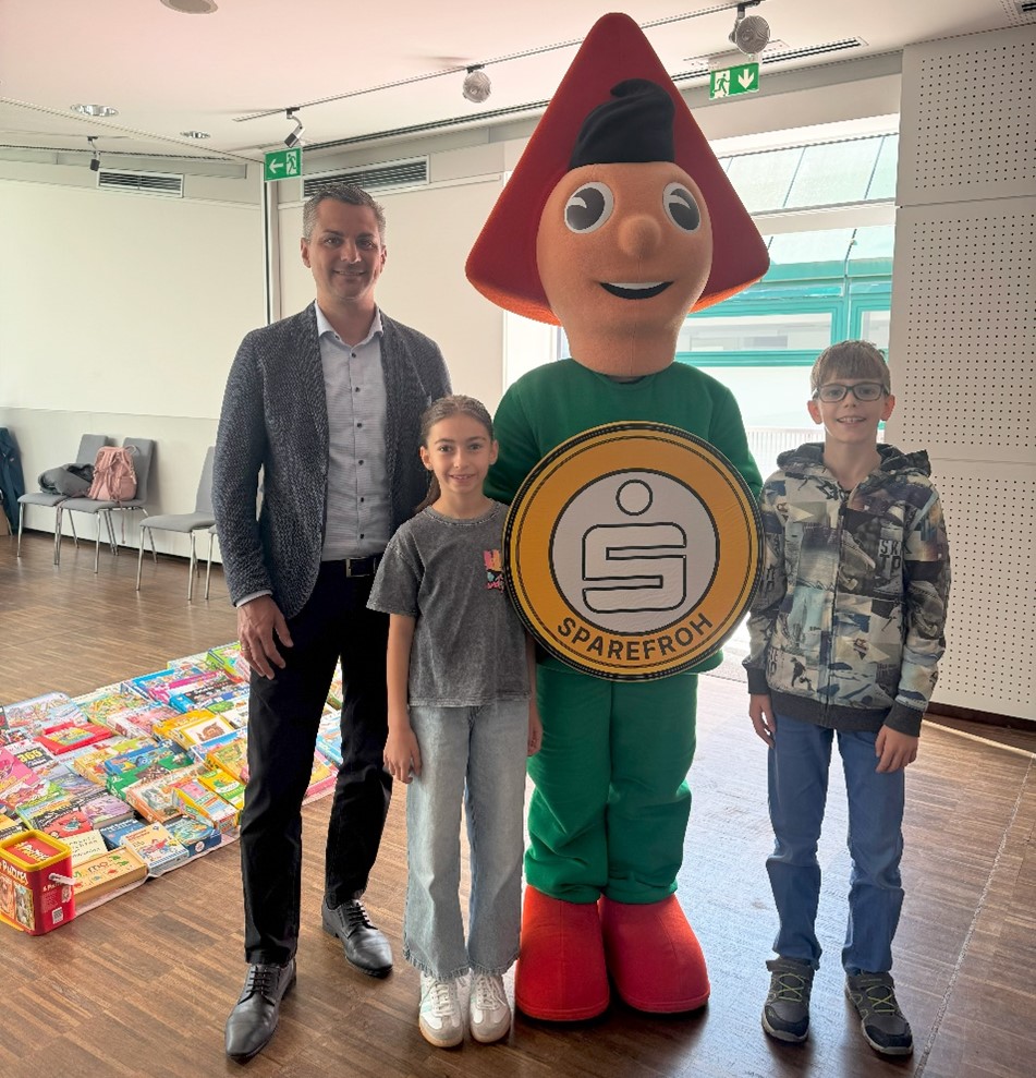 Foto: Freuten sich über einen erlebnisreichen Vormittag mit dem Sparefroh (v. l. n. r.): VDir. Martin Groiss (Sparkasse Herzogenburg-Neulengbach) , Mia Yaldiz und Konrad Stiefvater