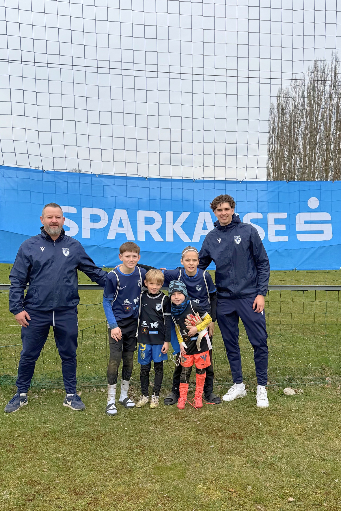 v.l.n.r Trainer Mario Weilbold und Gruender Marco Munk mit Nachwuchstalenten der Keeper Academy, ©Sparkasse