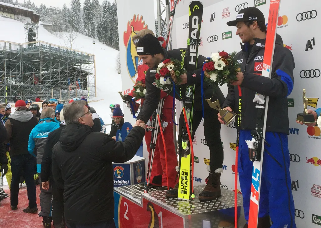 Sparkasse Vorstandsdirektor Franz Stöckl überreichte die Gams in Gold, Silber und Bronze an Sieger Gilles Roulin (SUI), Adrian Smiseth Sejersted (2. / NOR) und Nicolas Raffort (3. / FRA).