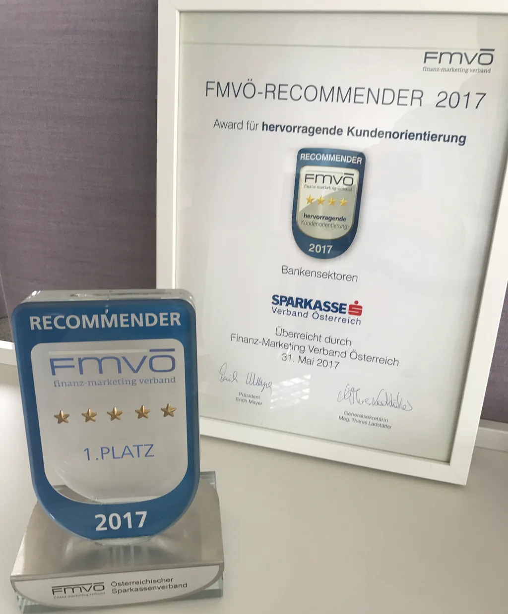Der Finanz-Marketing Verband Österreich (FMVÖ) prämiert jährlich die besten Banken und Versicherungen mit dem "Recommender Award" – eine Auszeichnung, die für besondere Kundenzufriedenheit vergeben wird und die Weiterempfehlungsbereitschaft misst. Österreichs Sparkassen erwiesen sich - wie bereits in den Jahren zuvor - als beste Bankengruppe und wurde mit dem Recommender Award 2017 für „hervorragende Kundenorientierung“ ausgezeichnet.