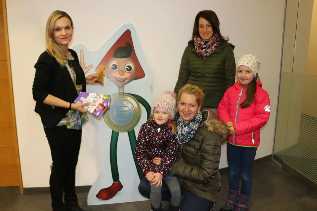 Kundenbetreuerin Franziska Eder mit den beiden Gewinnerinen Leni und Marina Schipflinger, mit Mama Getraud und Godi Christine