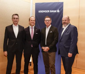 Foto v.l.n.r.: VD Christian Hager, Ronald-Peter Stöferle, Klaus Koch und VD Hansjörg Henneis freuten sich über einen gelungenen kremsinvest-Abend