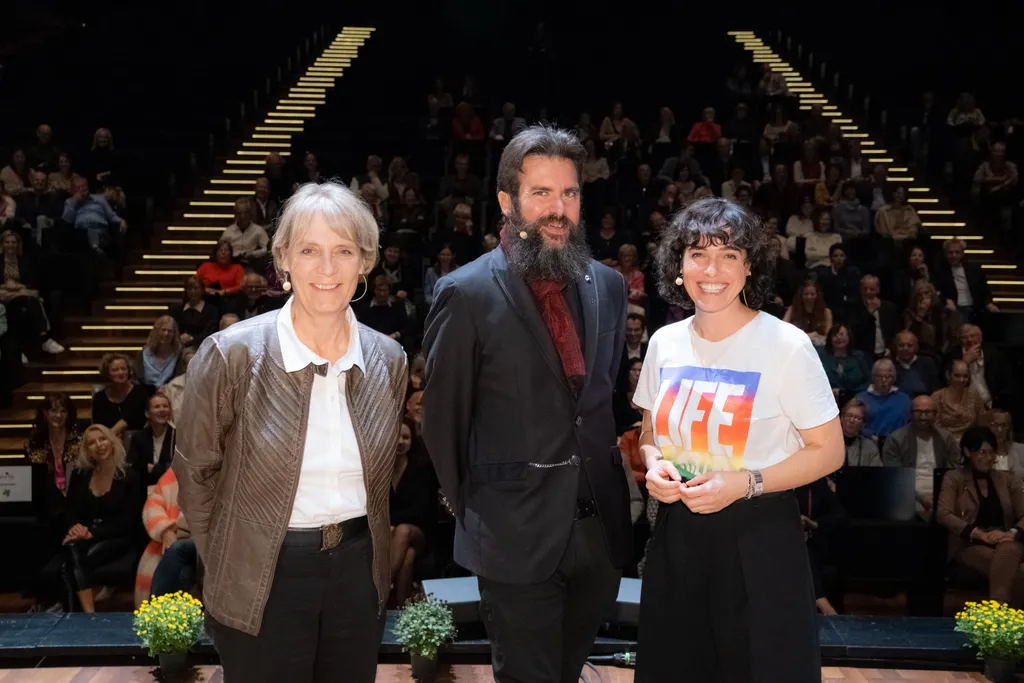 Große Bühne für Österreichs Schauspiel-Star Verena Altenberger und die deutsche Rallye-Dakar-Siegerin Jutta Kleinschmidt im Festspielhaus in Erl mit Kulturreferent Klaus Reithberger. Foto: Ka-ser/Kufsteinerland
