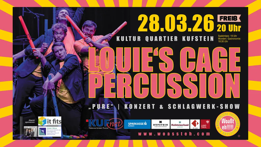 Durch die Verbindung von klassischen Instrumenten mit Synthesizern kreiert das Ensemble einen einzigartigen Sound und sprengt die Grenzen des klassischen Schlagwerk-Repertoires. Die Spielfreude und Virtuosität von Louie’s Cage Percussion sowie die eigenen Kompositionen und Arrangements sind die Handschrift des Ensembles: ohne Scheu vor Gegensätzen begegnen sich virtuoser Fusion-Jazz im 7/8-Takt und die Ouvertüre zu Verdis La forza del destino, Elemente von Minimal Music gehen Hand in Hand mit Debussys L’après-midi d’un faune. Wer von pure ein reduziertes Konzertprogramm erwartet, unterschätztdie Kreativität und den Schmäh von Louie’s Cage Percussion: Wenn der französische Koch die Bühne betritt oder die Boomwhacker auf der Bühne ausgebreitet werden, ist Humor und Unterhaltung auf höchstem Niveau garantiert! pure bringt die Harmonie zwischen den musikalischen und szenischen Qualitäten von Louie’s Cage Percussion auf ein neues Level und sorgt für einen höchst inspirierenden und abwechslungsreichen Abend, der das Publikum in staunende Sphären versetzt.