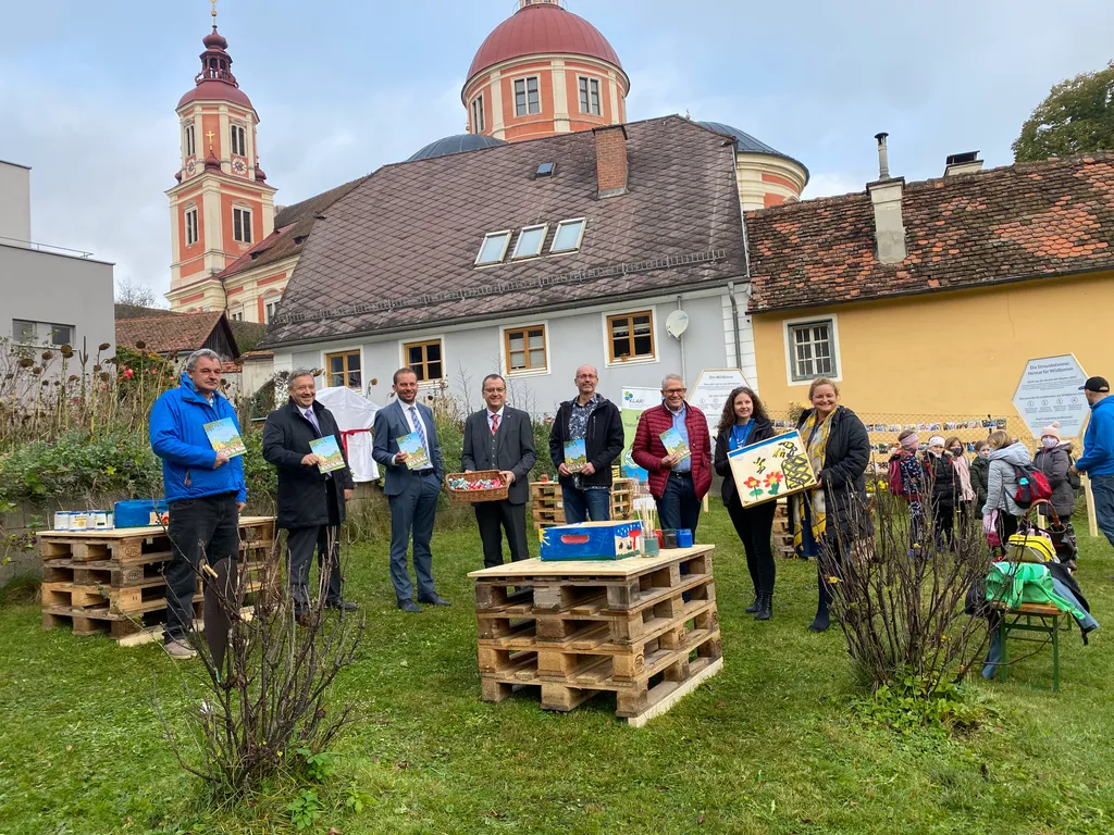 v.l.: Herbert Cividino (Bienenzuchtverein Pöllau), Johann Schirnhofer (Bürgermeister Marktgemeinde Pöllau), Jürgen Flicker und Johannes Kielnhofer (Vorstand Sparkasse Pöllau AG), Rudolf Schuppler (Illustrator Kinderbuch) und Rudolf Gigler (Kinderbuchautor), Victoria Allmer (KEM Naturpark Pöllauer Tal) und Christine Schwetz (Tourismusverband Pöllauer Tal).