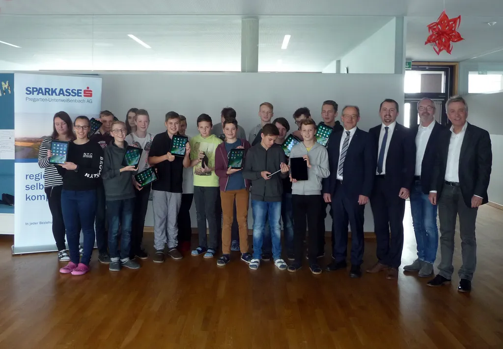 Ende Jänner übergaben Vorstandsdirektor Martin Zwittag und Geschäftsstellenleiter Ing. Anton Miesenberger an Herrn Direktor Reinhardt Bauer 30 Stück iPads als Unterstützung für den Informatikunterricht. Bei der Übergabe bedankte sich auch Bürgermeister Anton Scheuwimmer für die großzügige finanzielle Unterstützung.
