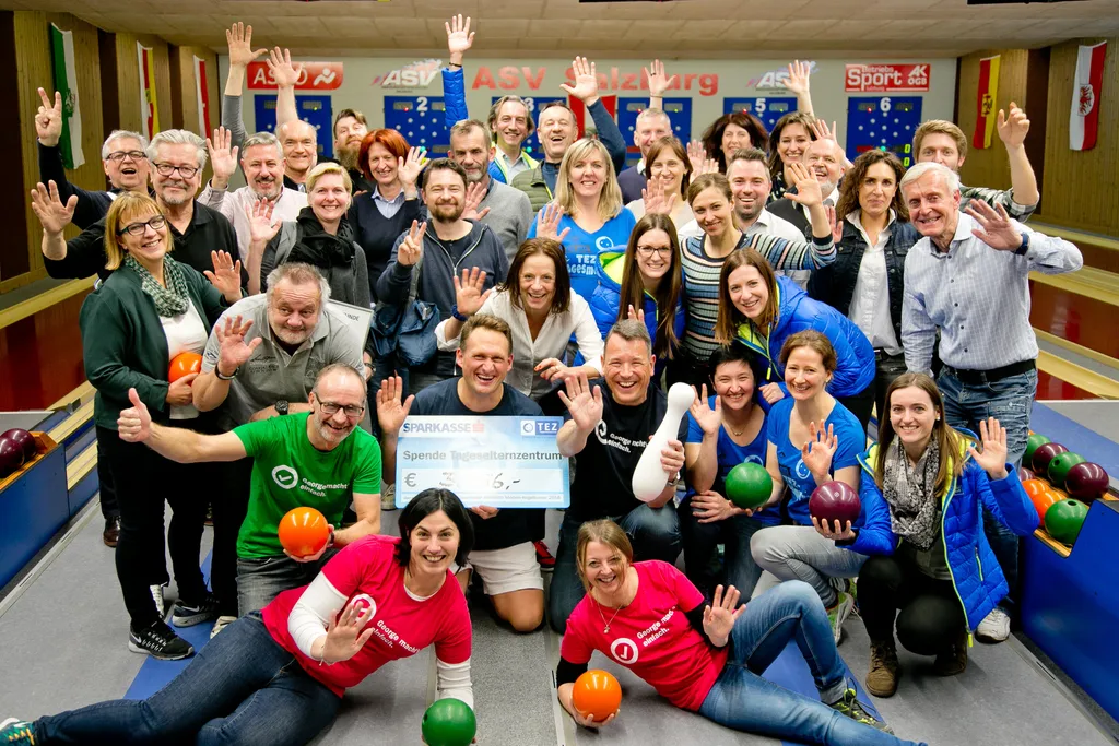 Dienstagabend versammelten sich über 30 Salzburger Medienvertreter auf der Kegelanlage des ASV Salzburg, um sich in insgesamt acht Teams für einen gemeinnützigen Zweck sportlich zu messen. Ein Sieger stand gleich von Anfang an fest: Das TEZ – Zentrum für Tageseltern in Salzburg. Jeder geworfene Kegel wurde von der Salzburger Sparkasse eins zu eins in Spendeneuros umgerechnet. So fielen insgesamt beachtliche 3.456 Kegel an diesem Abend um und es konnte somit ein Spendenscheck in Höhe von 3.456 Euros an das TEZ übergeben werden.