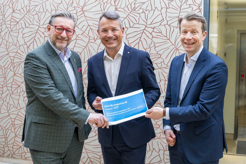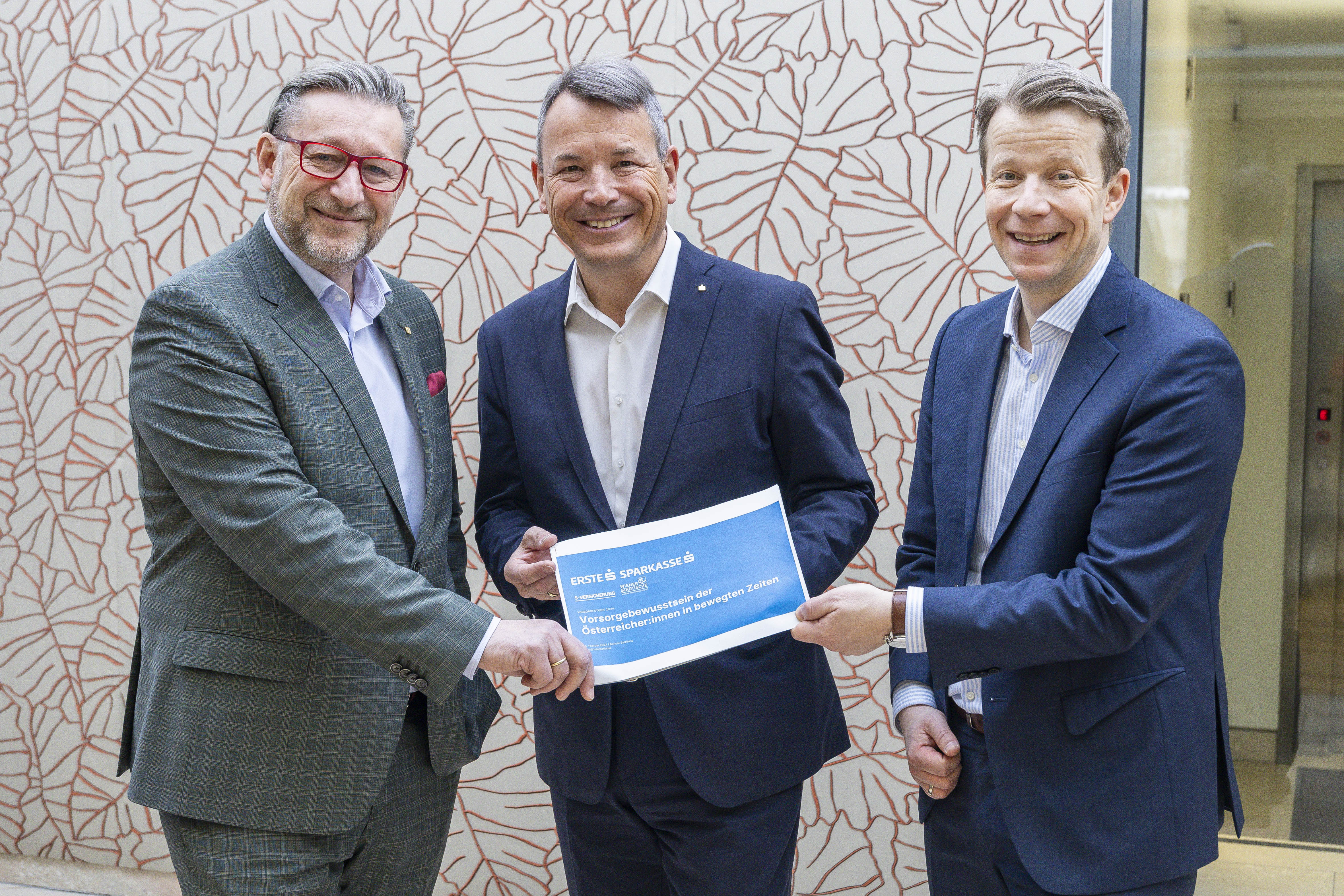 Versicherungsdirektor Manfred Bartalszky, Sparkassenvorstand Markus Sattel und Marktforscher Paul Eiselsberg bei der Präsentation der Vorsorgestudie 2024, Fotonachweis: wildbild.at, Abdruck honorarfrei.