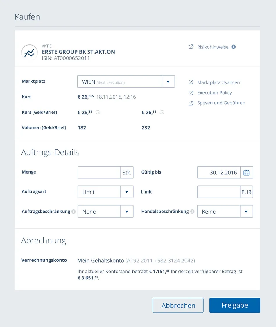 Eine in George integrierte Marktdaten-Plattform bietet Investoren aktuelle Informationen rund um Wertpapiere, Indizes genauso wie Wirtschaftsdaten zu unterschiedlichen Ländern und Finanznews. Im börslichen Handel können Aktien, ETFs, Fonds, Zertifikate sowie Optionsscheine gehandelt werden, außerbörslich u.a. auch Fonds oder Zertifikate im Direkthandel über die Emittenten. Es kann zu jedem Wertpapier – egal ob bereits im Depot oder noch nicht – ein Kursalarm gesetzt werden der per SMS oder E-Mail eine Benachrichtigung verschickt, sobald der eingestellte Kurswert erreicht wurde. Aktivieren kann man diese Wertpapierhandel-Funktion zu einem bestehenden Wertpapier-Depot direkt in George, wo man im Zuge dessen, auch das Risikoprofil festlegen und adaptieren kann. Videocast zum Wertpapierhandel: https://www.erstebank.at/george-wertpapierhandel