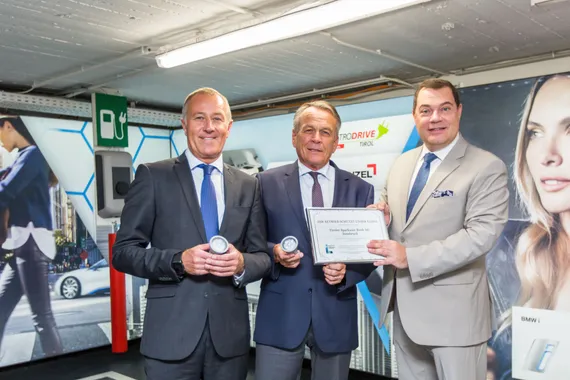 Foto v.l.: Christian Reingruber (Vorstand Tiroler Sparkasse), Harald Schneider (Vorstand IKB) und Hans Unterdorfer (Vorstand Tiroler Sparkasse) mit der Auszeichnung des BMLFUW Fotonachweis: Thomas Steinlechner, Abdruck honorarfrei.