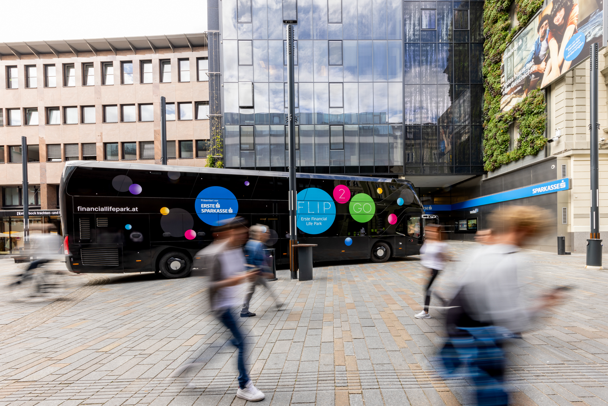 Erste Bank und Sparkassen haben mit FLiP2Go ein standortunabhängiges Tool geschaffen, das spielerisch praxisnahes Wissen im Finanzbereich vermittelt. An sieben interaktiven Stationen erlernen Schüler:innen den eigenständigen Umgang mit Geld. Zu den Stationen gehört zum Beispiel die „WeltReise“, die den Einfluss von Konsumentscheidungen auf globale Produktionsketten verdeutlicht. Beim „AusgabenCheck“ müssen Haushaltsbudgets auf verschiedene Ausgabengruppen aufgeteilt werden, um die Wichtigkeit der persönlichen Budgetplanung zu veranschaulichen. FLiP2Go richtet sich an Kinder und Jugendliche im Alter von 10 bis 17 Jahren und bietet 100-minütige Spielrunden in zwei Schwierigkeitsstufen an. Der Bus ist mit großen HD-Touchscreens ausgestattet, auf denen die verschiedenen Aufgaben gespielt und gelöst werden können. Menschen mit eingeschränkten Bewegungsmöglichkeiten finden eine barrierefreie Spielstation im Unterdeck des Busses. Die digital-pädagogisch aufbereiteten Themen werden von zwei virtuellen Guides vor dem Spiel erklärt. Abschließend werden die Lerninhalte zusammengefasst. Alle Inhalte wurden von einem wissenschaftlichen Beirat internationaler Expert:innen geprüft und freigegeben. Der Finanzbildungsbus wurde 2019 anlässlich des 200-Jahr-Jubiläums der Sparkassengruppe ins Leben gerufen.